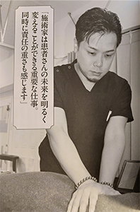 そこで、同氏は歪みの原因となっている関節に施術を行い、その動きをスムーズにすることで、通常のマッサージではほぐせない小さな筋肉までほぐし、痛みの根本改善を実現しているのだという。施術に際しては良くなっていくイメージを患者に伝え、身体以外の悩みに耳を傾けるなど心のケアも欠かさない。「患者の未来を変え感動を与える」という使命を胸に、同氏の奮闘は続く。