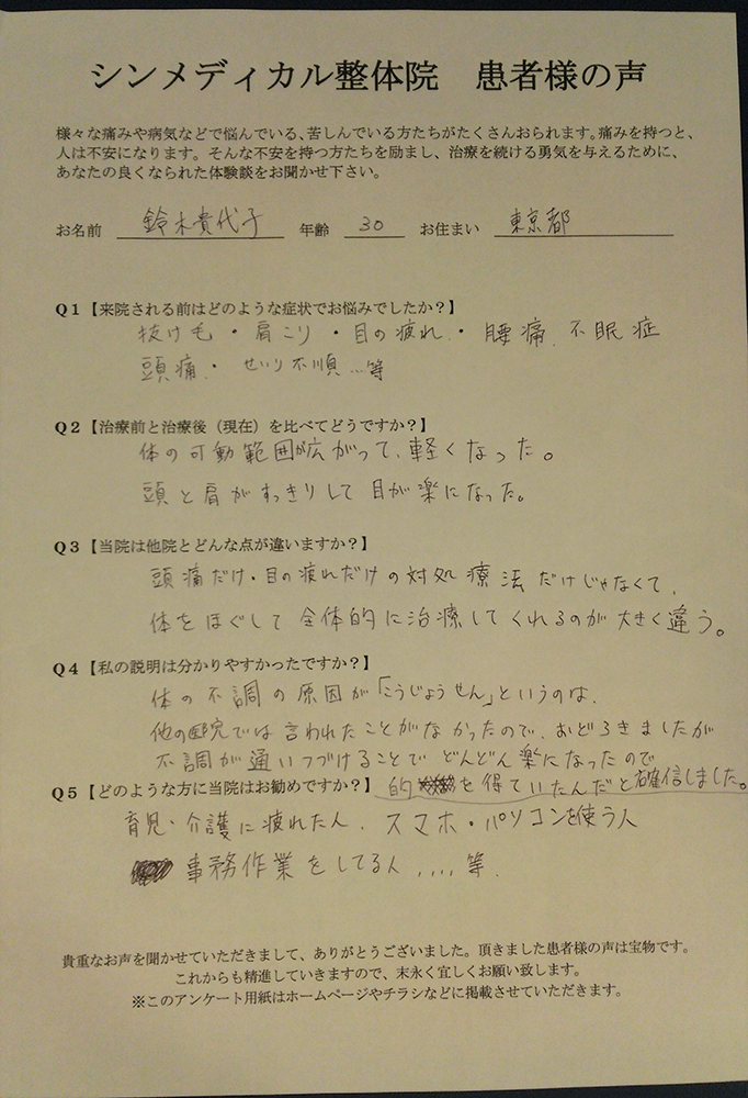 - 頭痛だけ・目の疲れだけの対処療法だけじゃなくて、体をほぐして全体的に治療してくれるのが大きく違う。