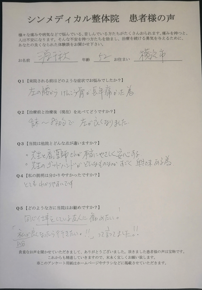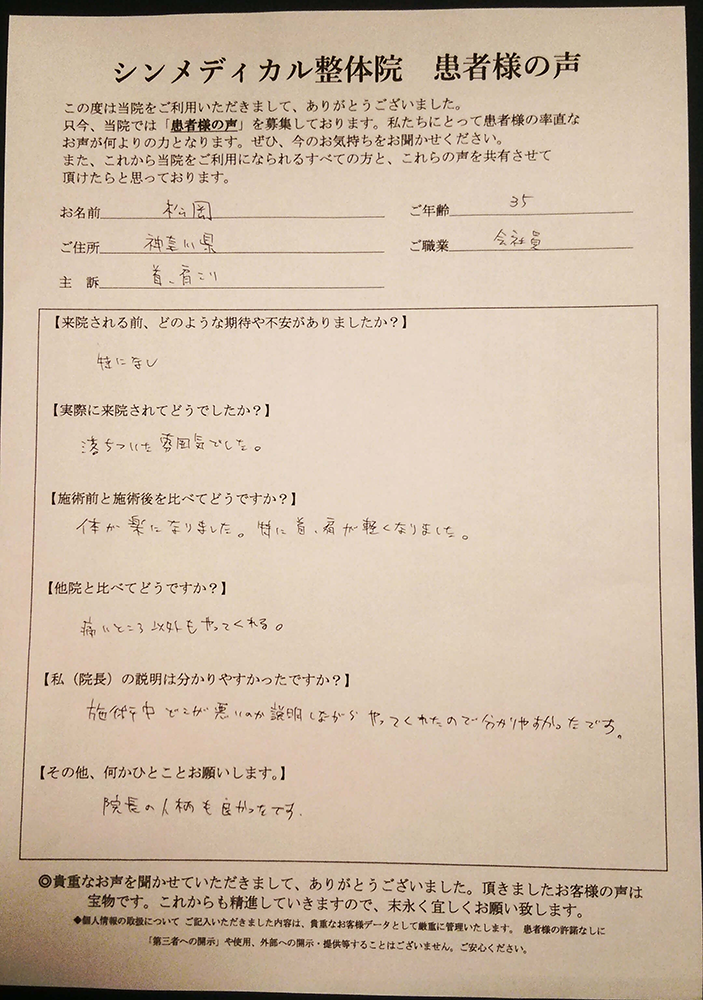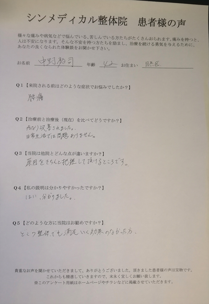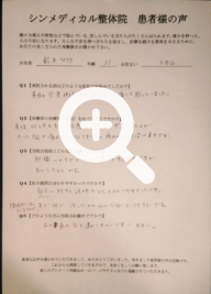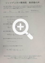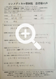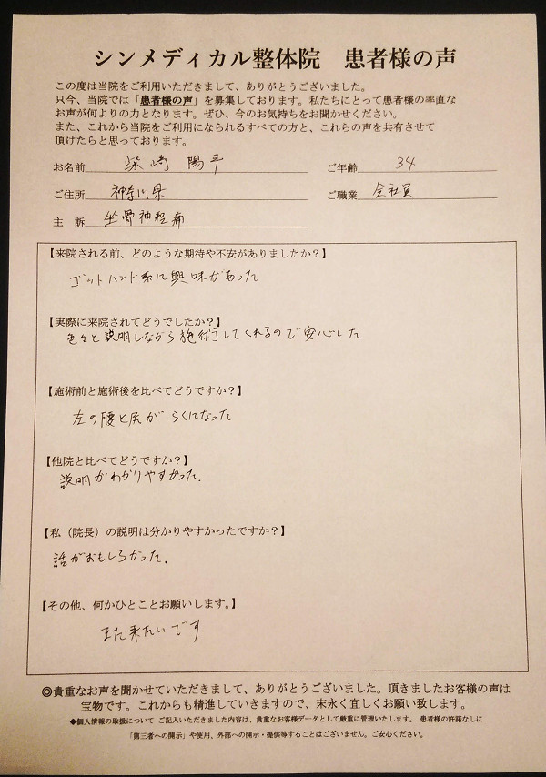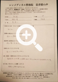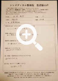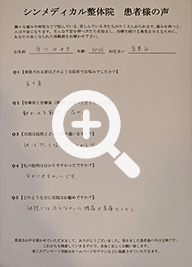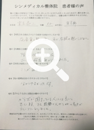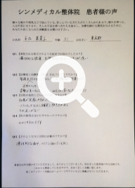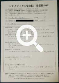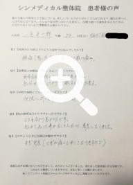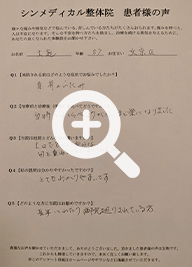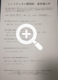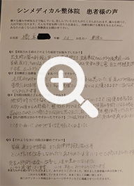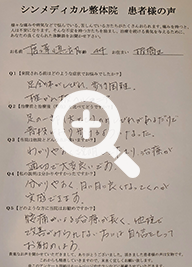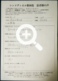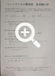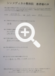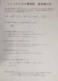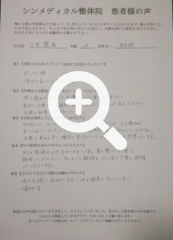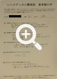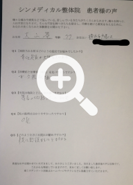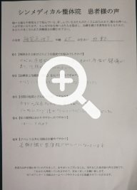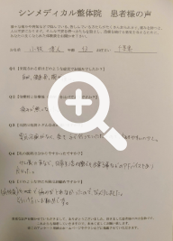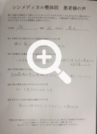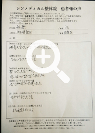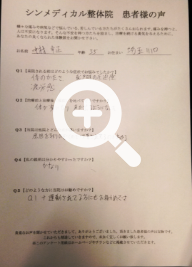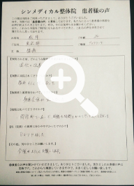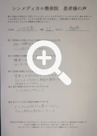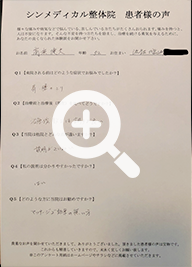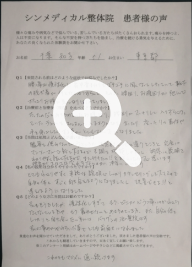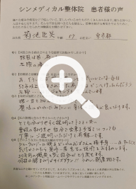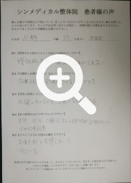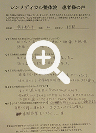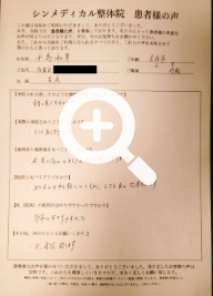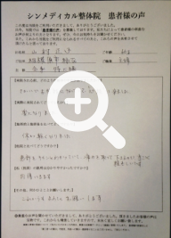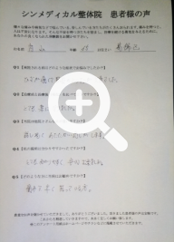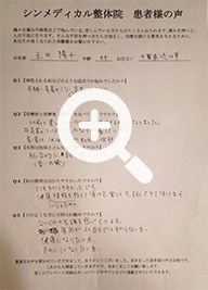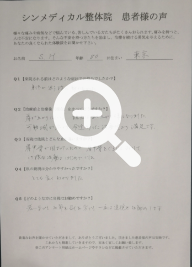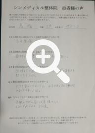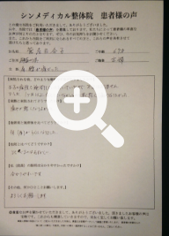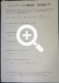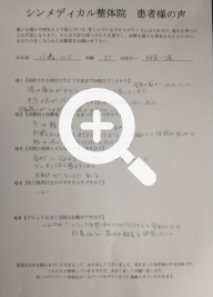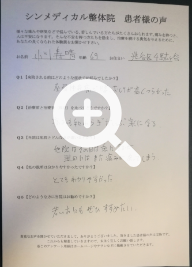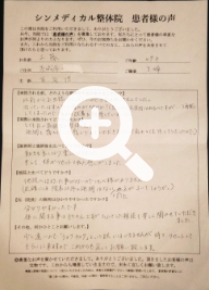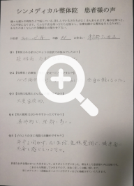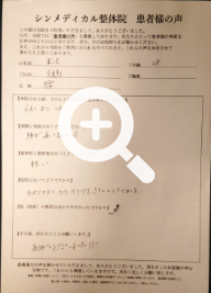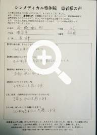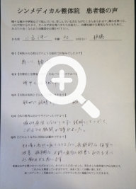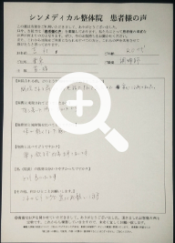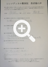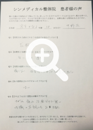 - 他院では、マッサージや施術を受けた翌日には、もう痛みが戻ってしまっていました。シンメディカル整体院さんはそのようなことがなく、治療を重ねる度に確実に良くなっていくんだろうなあと実感しています。