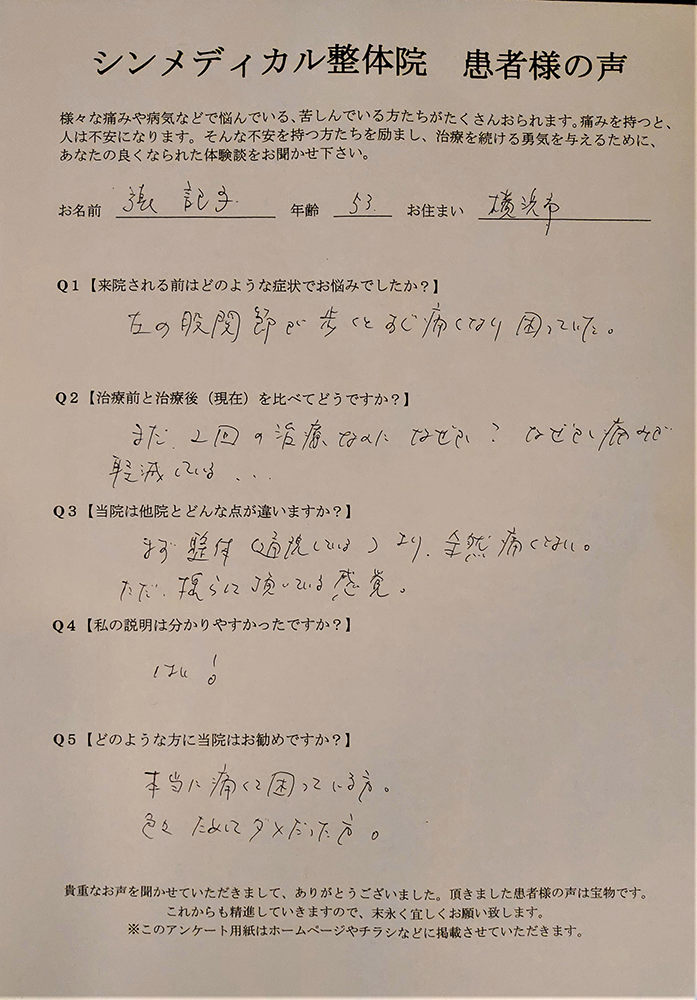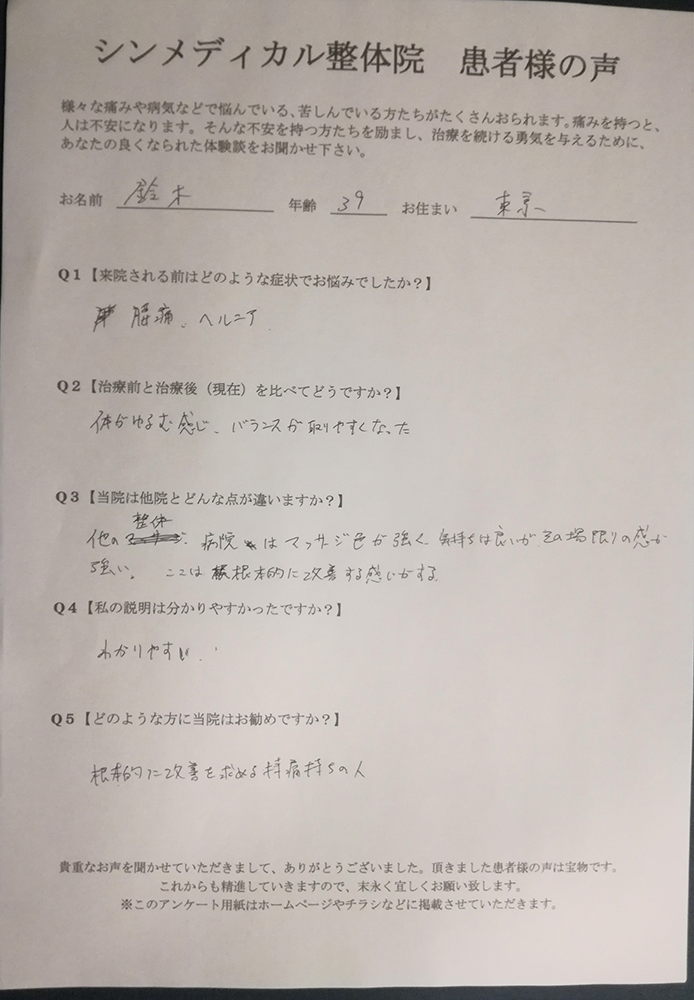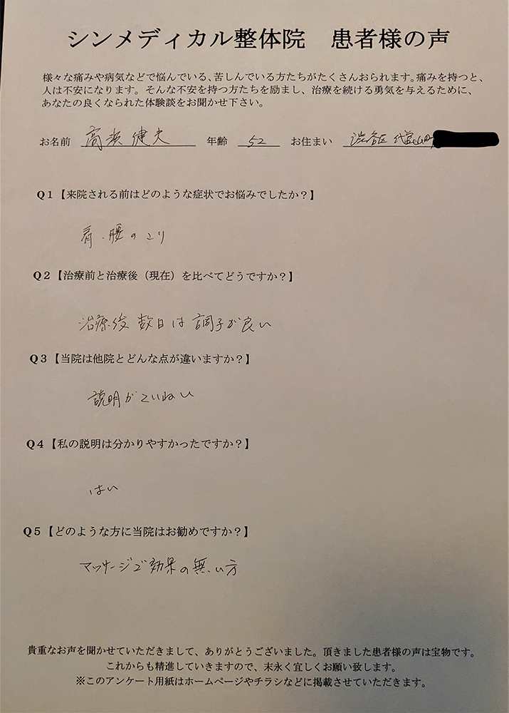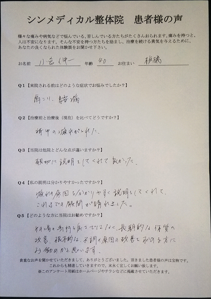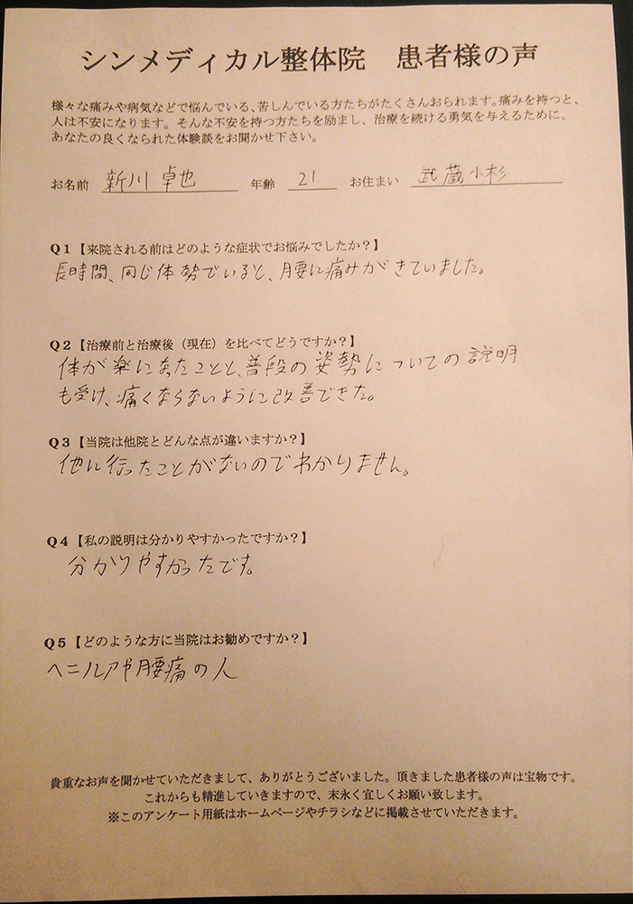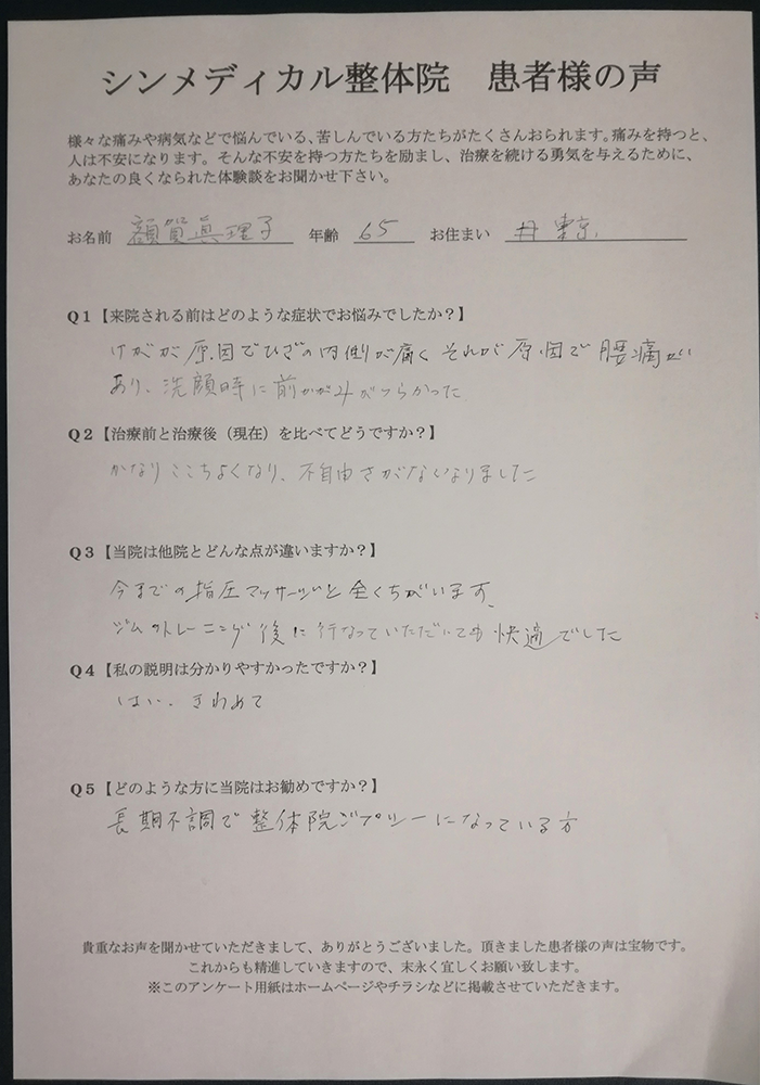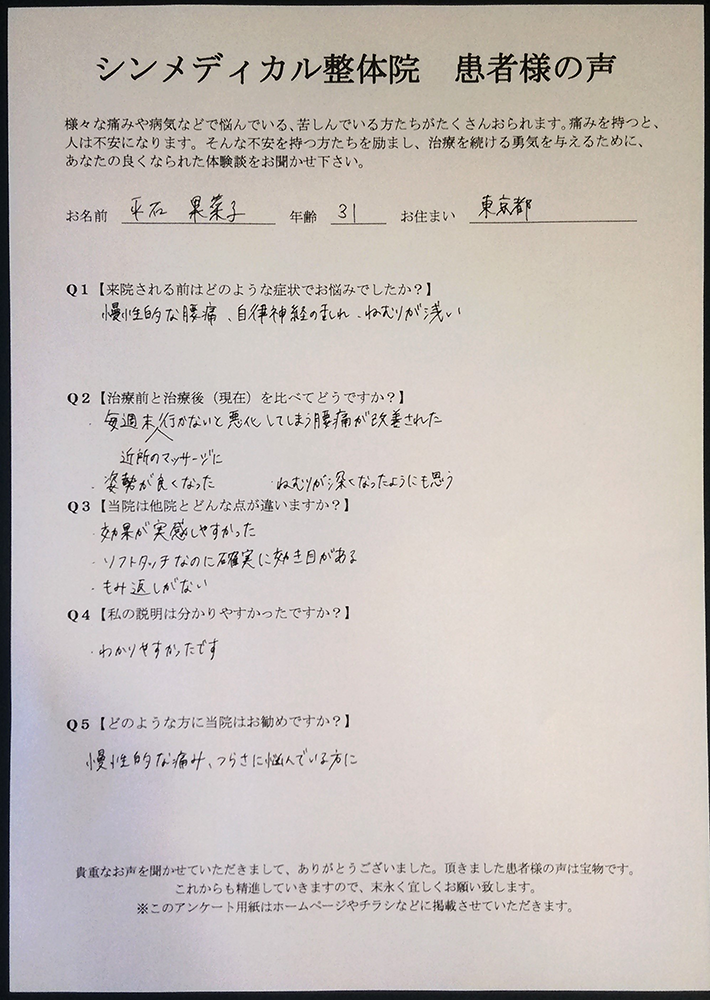 - 他院では、マッサージや施術を受けた翌日には、もう痛みが戻ってしまっていました。シンメディカル整体院さんはそのようなことがなく、治療を重ねる度に確実に良くなっていくんだろうなあと実感しています。