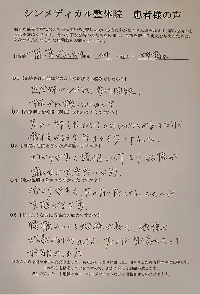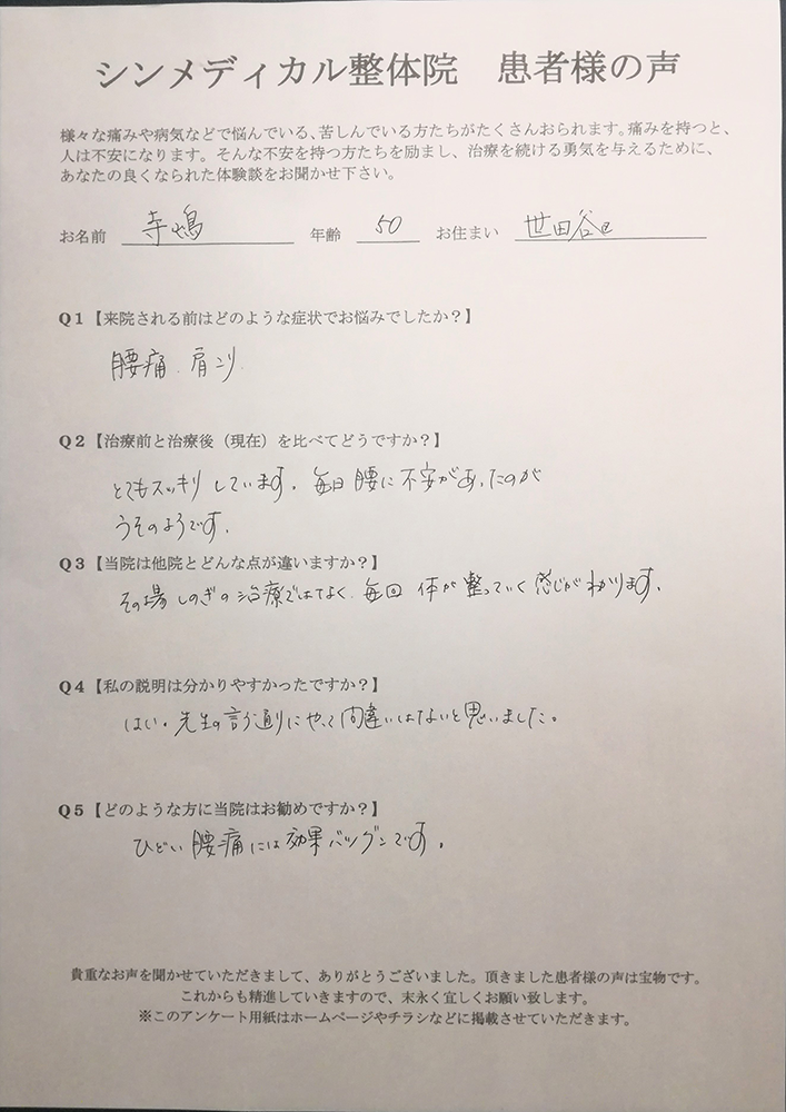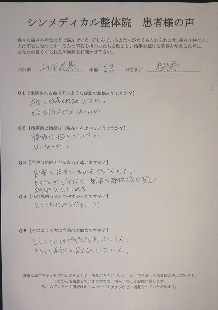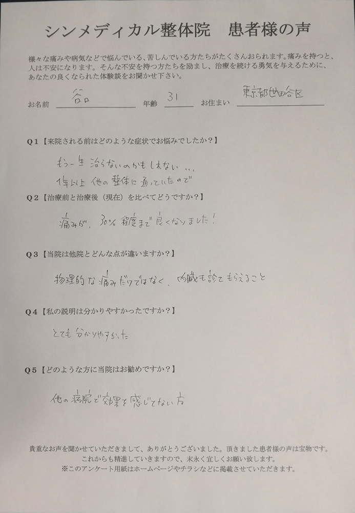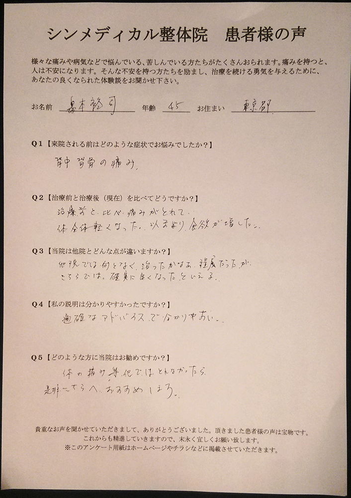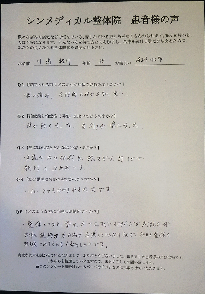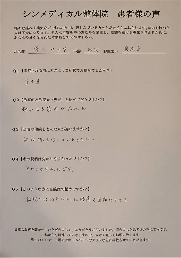 - 他院では、マッサージや施術を受けた翌日には、もう痛みが戻ってしまっていました。シンメディカル整体院さんはそのようなことがなく、治療を重ねる度に確実に良くなっていくんだろうなあと実感しています。