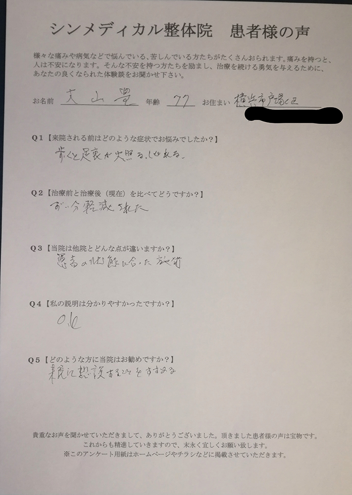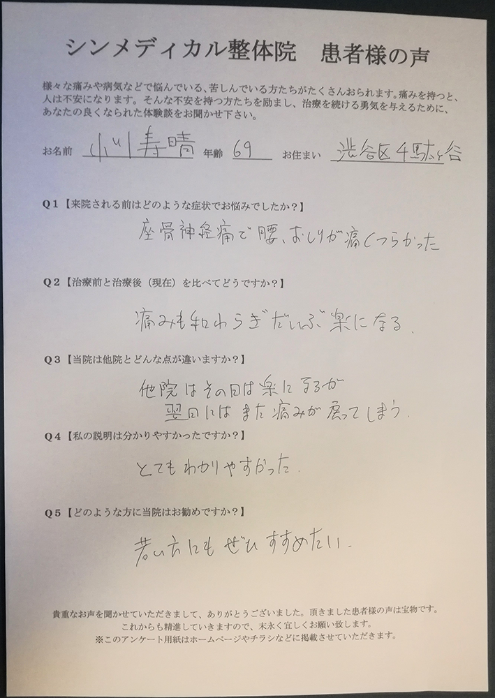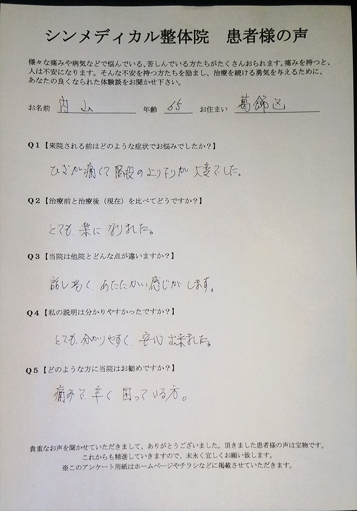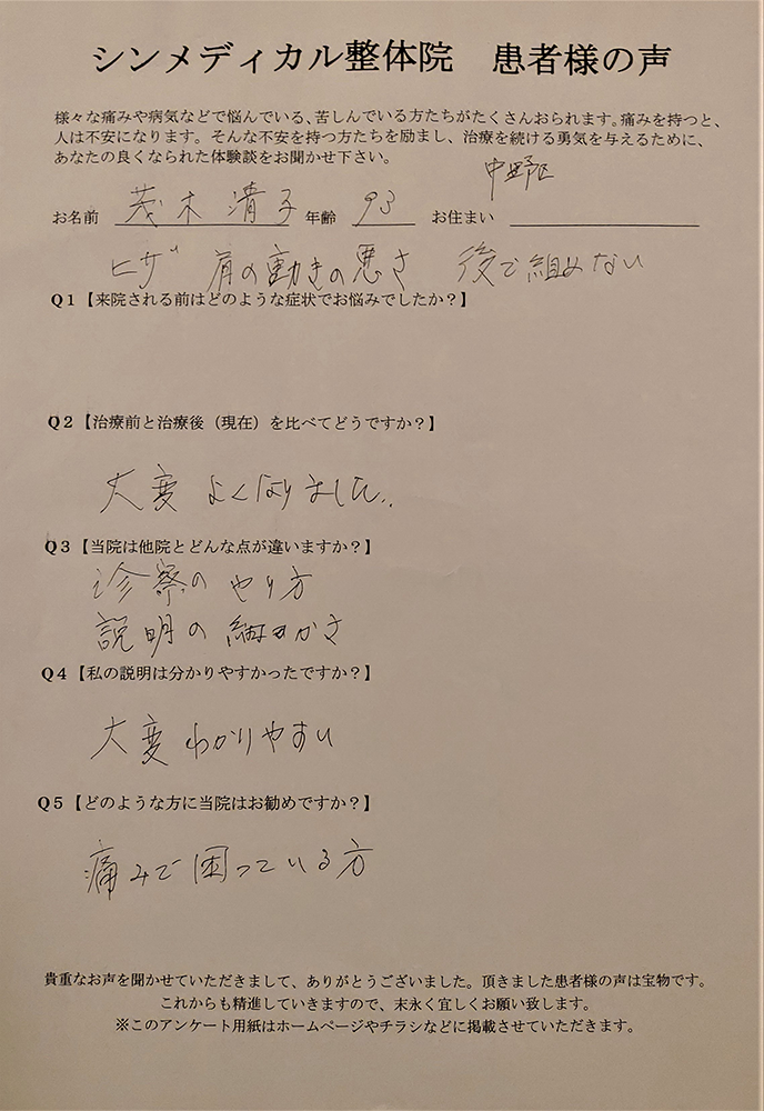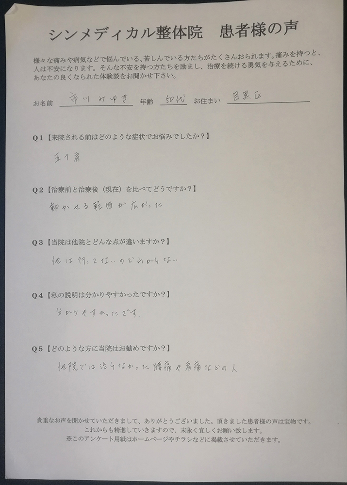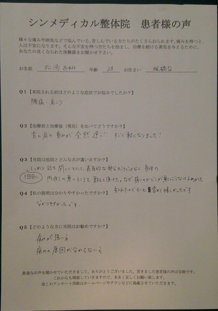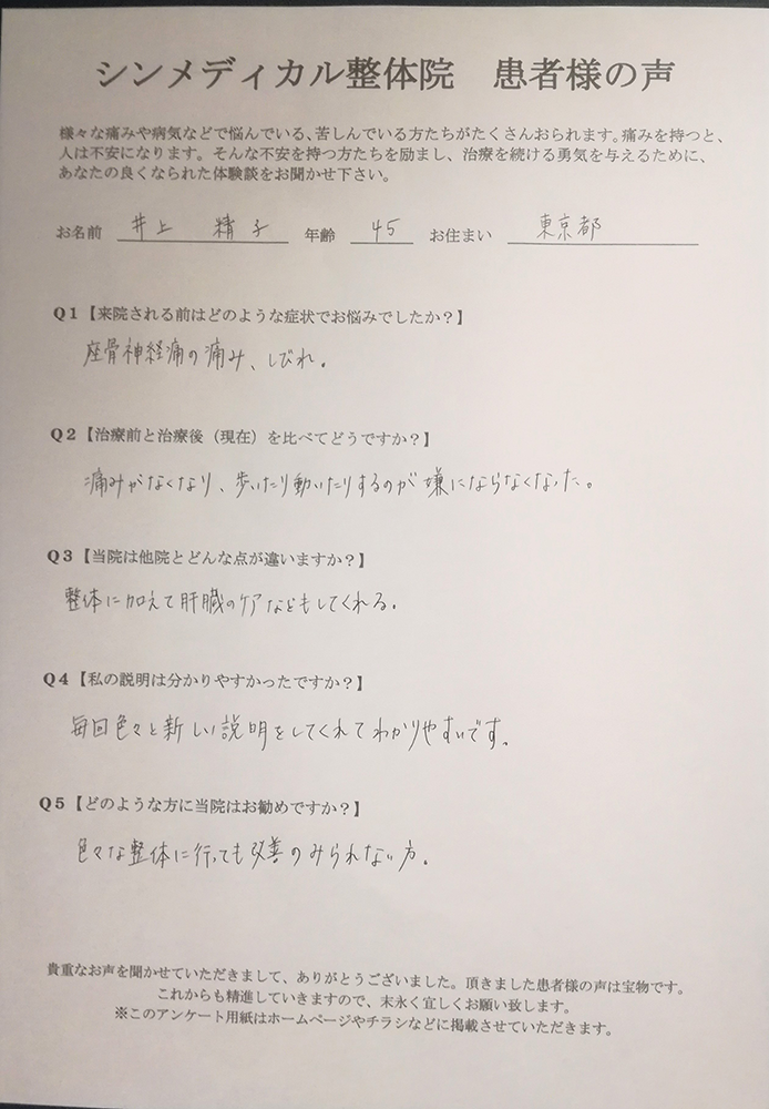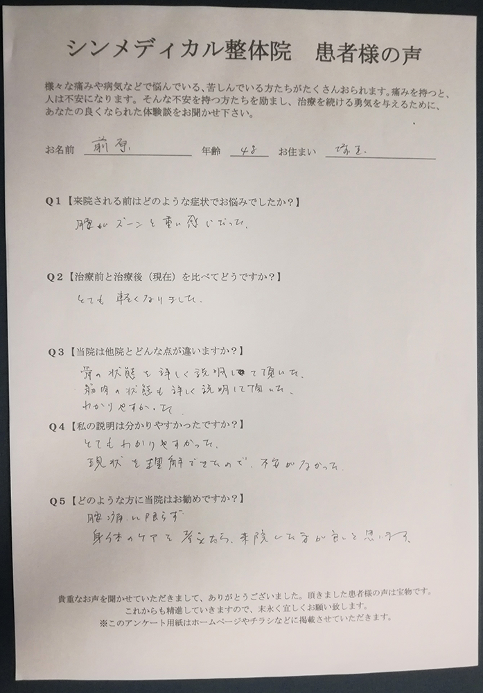 - 他院では、マッサージや施術を受けた翌日には、もう痛みが戻ってしまっていました。シンメディカル整体院さんはそのようなことがなく、治療を重ねる度に確実に良くなっていくんだろうなあと実感しています。
