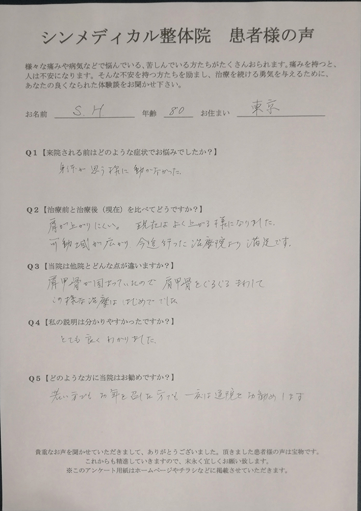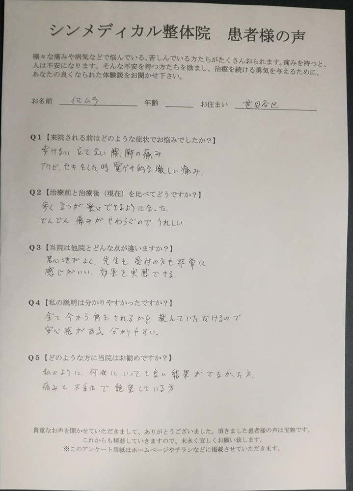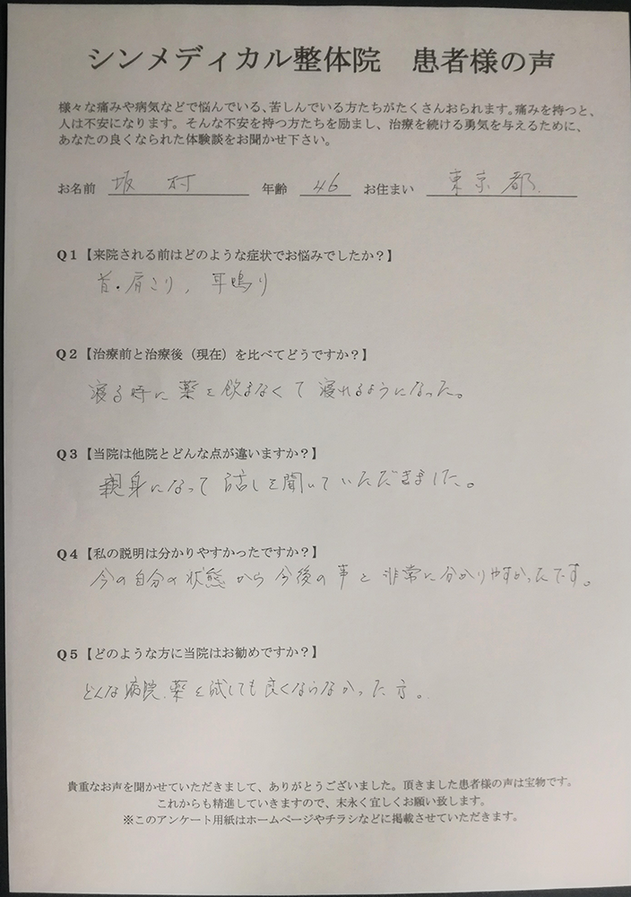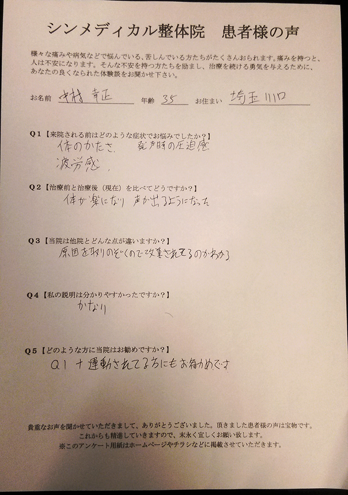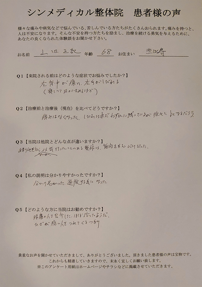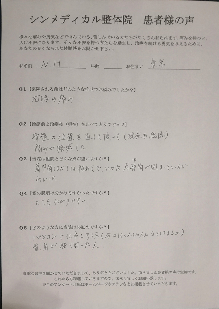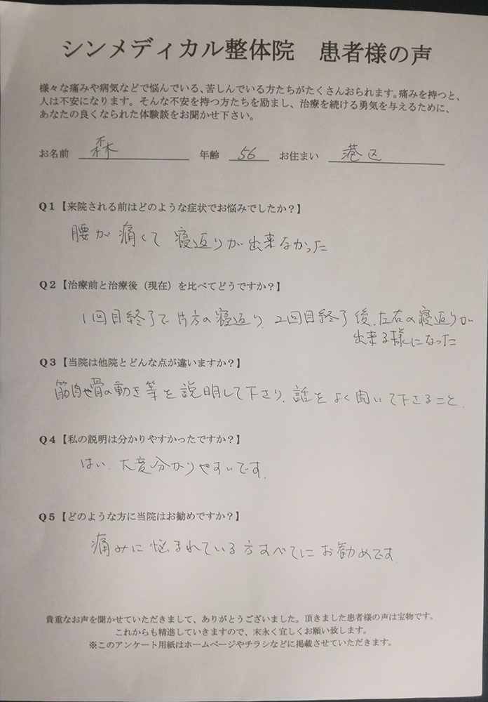 - 他院では、マッサージや施術を受けた翌日には、もう痛みが戻ってしまっていました。シンメディカル整体院さんはそのようなことがなく、治療を重ねる度に確実に良くなっていくんだろうなあと実感しています。
