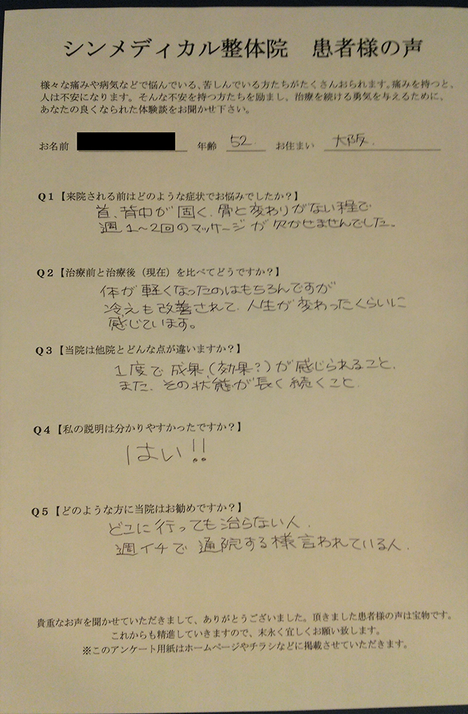 - 通院初めてからまだ5回位ですが、一生背負うと思っていた首肩のコリや痛みが普段忘れてる程に良くなり、ちょっと無理をしても翌日には回復できるまでに良くなってビックリしています。