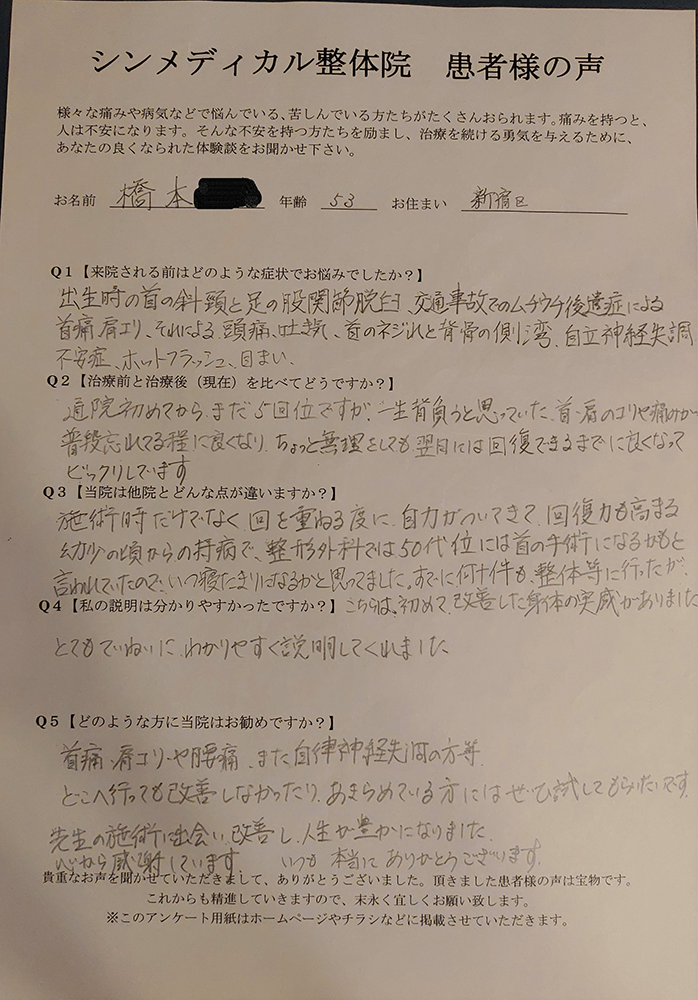 一生背負うと思っていた首肩のコリや痛みが普段忘れてる程に良くなり、ちょっと無理をしても翌日には回復できるまでに良くなってビックリしています。