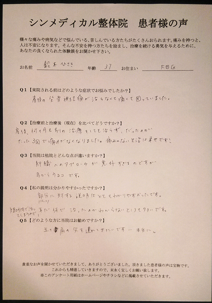 産後、何ヶ月も別の治療をしても治らず、だったのが、たった3回で痛みがなくなりました。痛みのない生活は幸せです!
