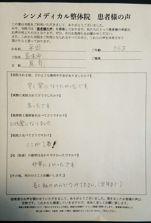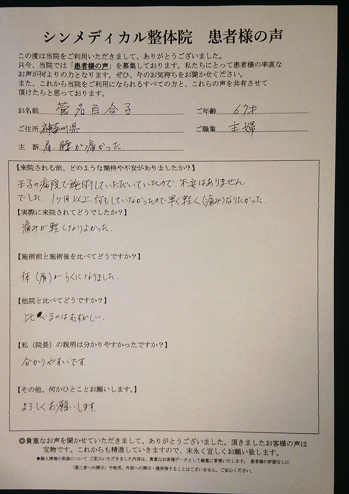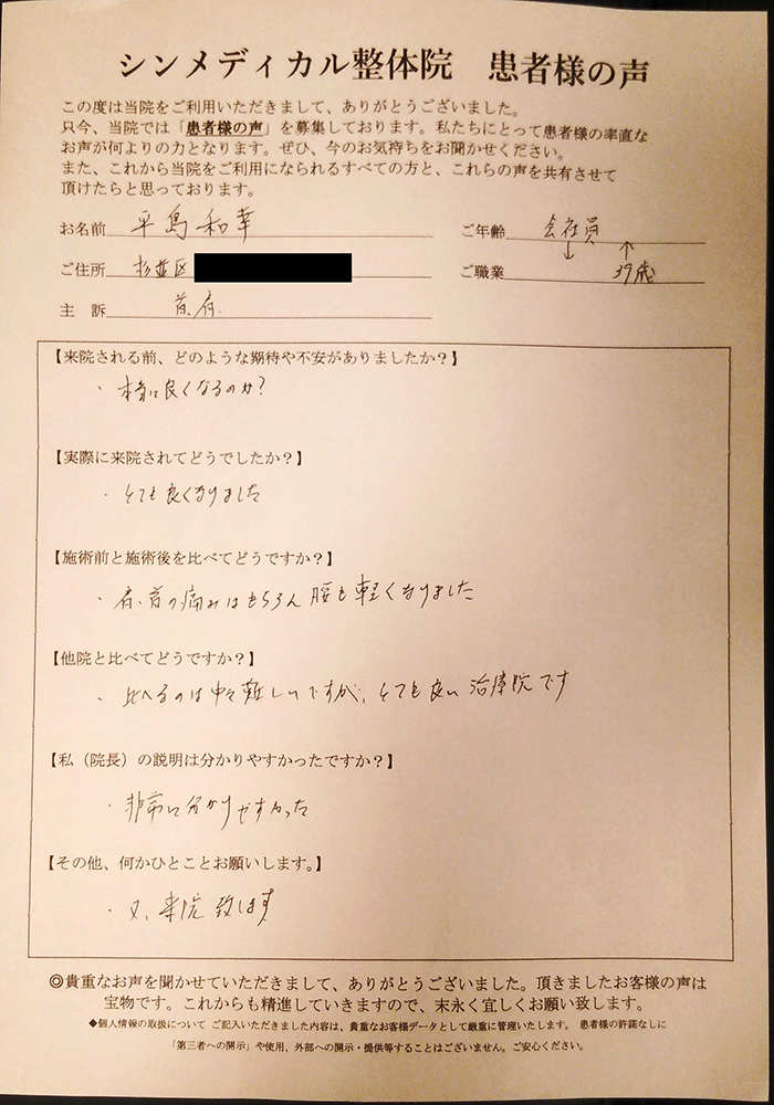 - 以前からお世話になっていたので不安はありませんでした。治っていたはずの首の痛みがなぜか?(思いあたる原因はあるのですが…)再発してしまったので痛みの改善を期待していました。