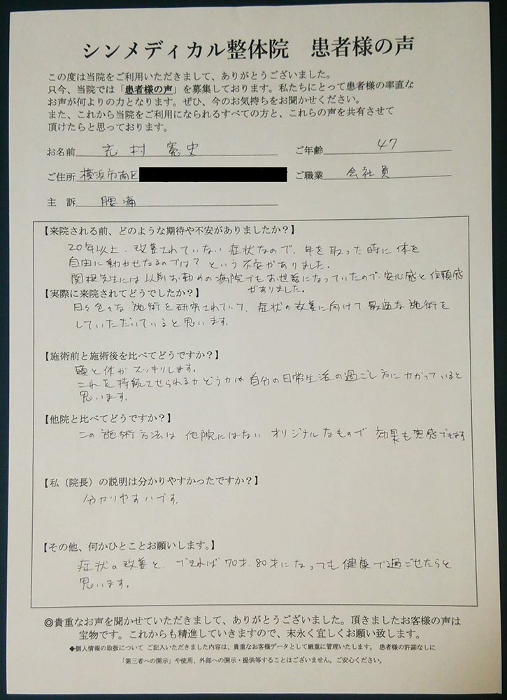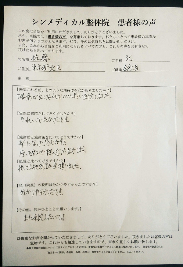 斉藤さん / 30才 / 神奈川県横浜市在住 / 公務員 / 主訴:腰痛