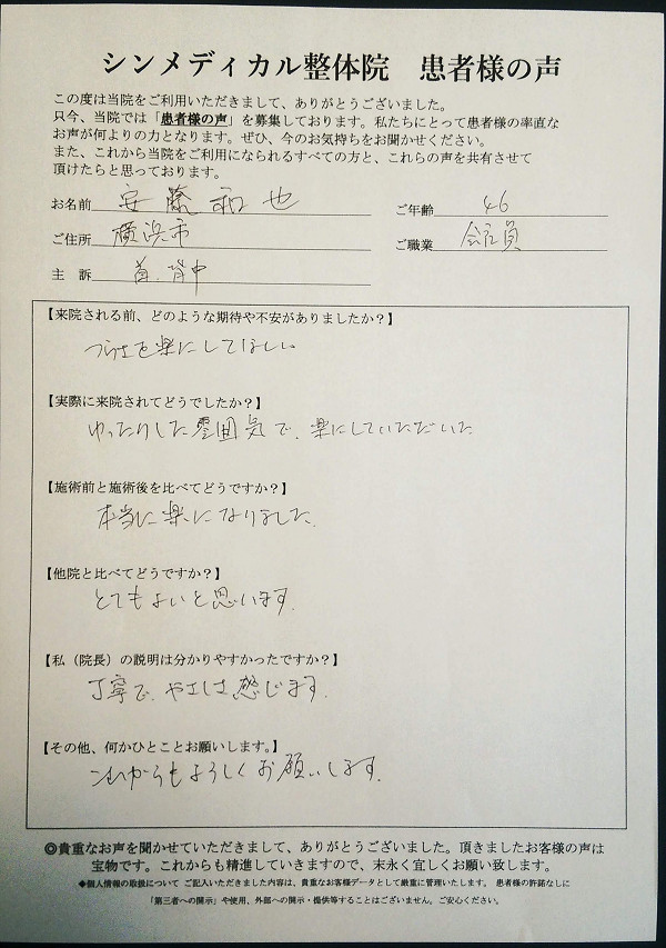 安藤さん / 46才 / 横浜市 / 接客 / 主訴:首、背中